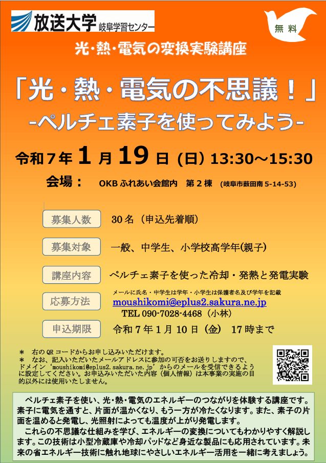 2024.12.18 ☆新規プログラムを掲載しました。☆ 光・熱・電気の変換実験講座 「光・熱・電気の不思議!」-ペルチェ素子を使ってみよう- https://kankyogakusyu.leapy.site/program/category/decarbonization/p49637/ 放送大学ペルチェちらし070119