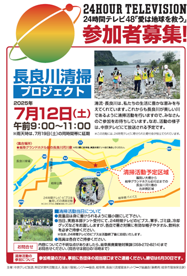 清流・長良川は、私たちの生活に豊かな恵みを与えてくれます。これからも長良川が美しい川であるように清掃活動を行いますので、みなさんのご参加をお待ちしています。なお、活動の様子は、中京テレビにて放送される予定です。